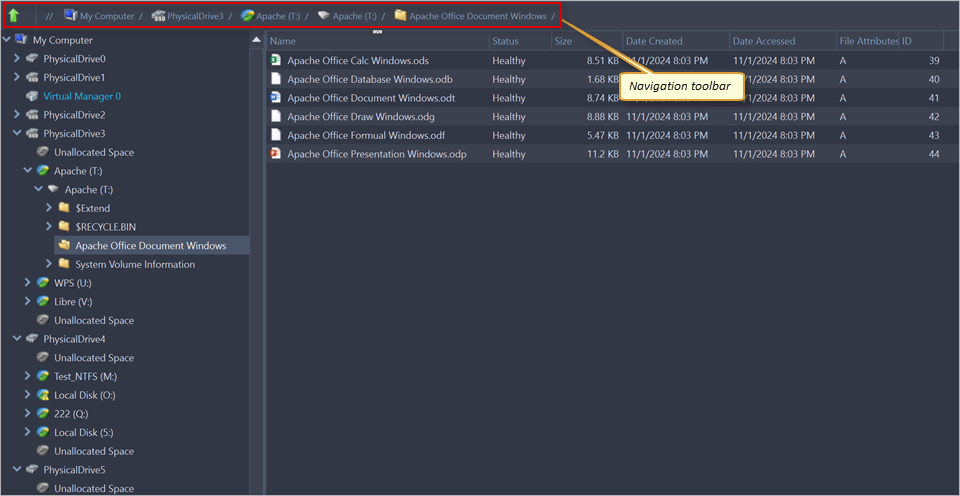 The File Browser tab displays files and folders on the selected disk. Browsing through the folders tree is performed the same way as in the default OS Explorer. The File Browser tabbed view may also be adjusted using the Customize menu.