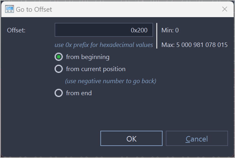 You can use both decimal and hexadecimal values, preceding hexadecimal values with 0x. For example, to specify location 512 as a hexadecimal number, enter 0x200. There are also options to specify an offset from the beginning, from the current position, or from the end.